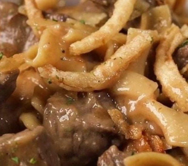 Simmer the beef on low for 10 minutes, then add the egg noodles and simmer for 10 more minutes, stirring occasionally until the noodles are tender.
